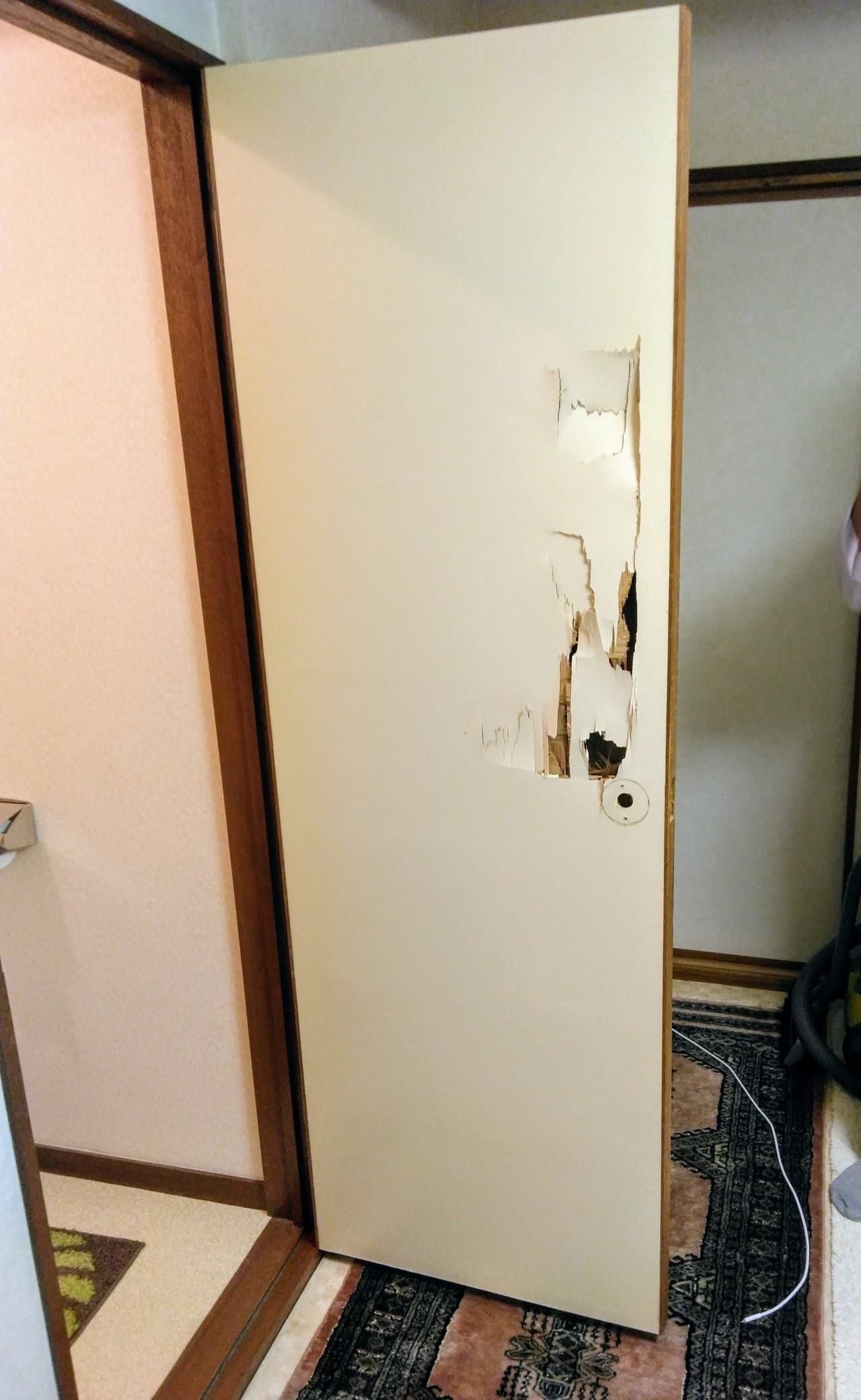 不用品片付け訪問の日に、偶々トイレのドアノブ故障にて、トイレから出れずにドアを破壊。